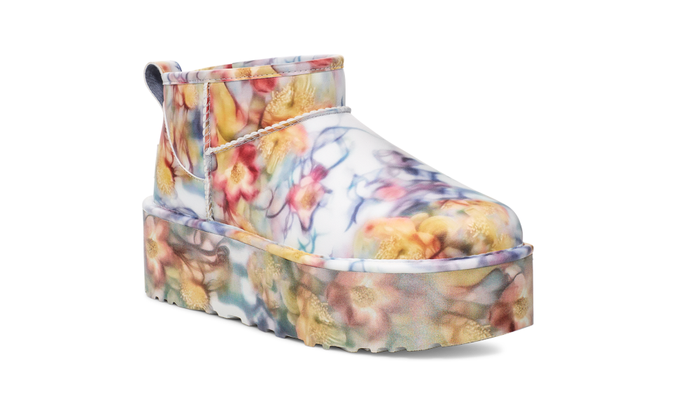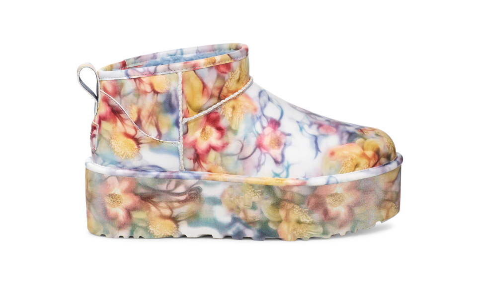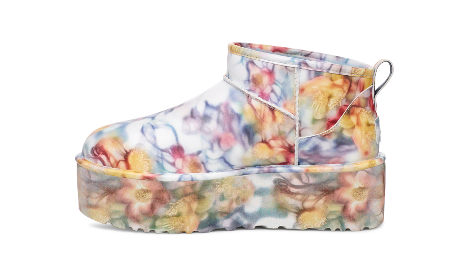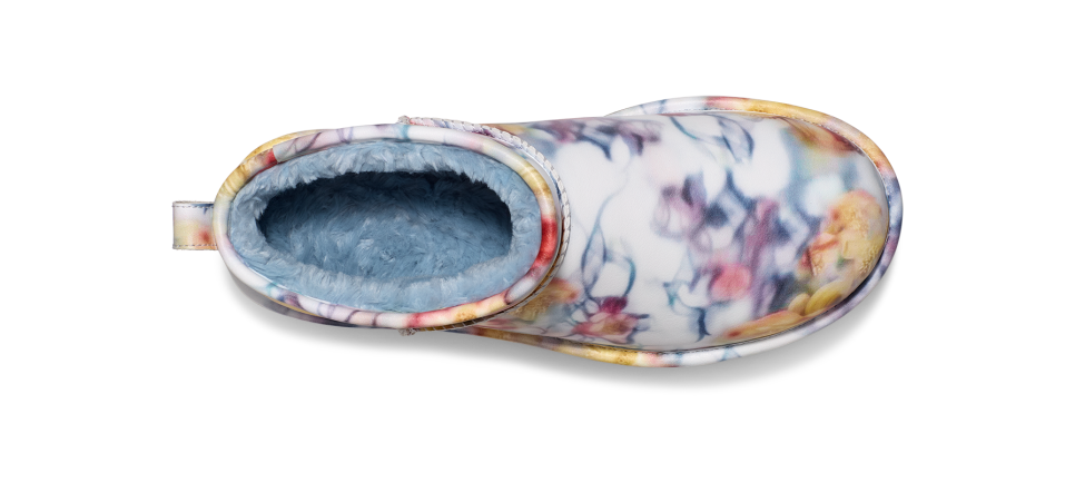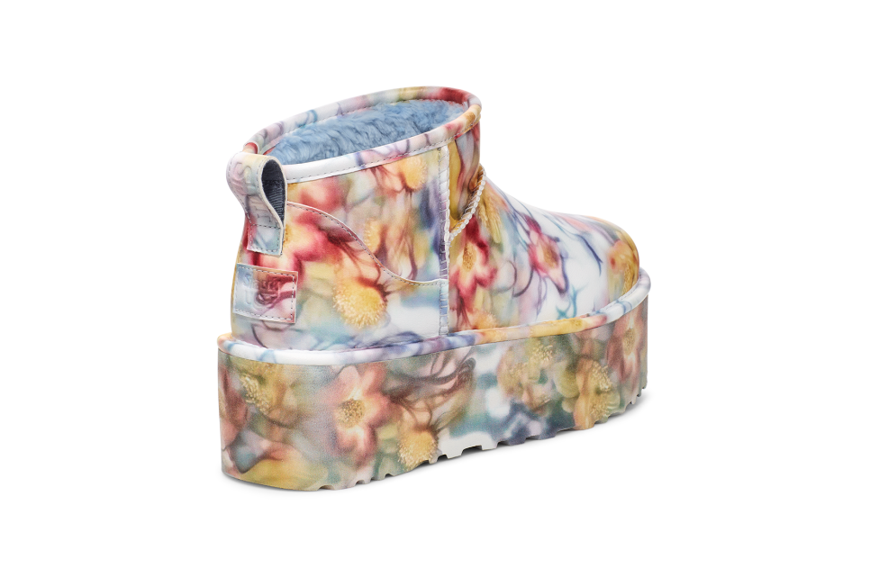 - Rear pull tab, Asymmetrical topline, Barbed Flowers Print, Synthetic coating made from a 52% plant-based composition applied to a 100% recycled microfiber backer